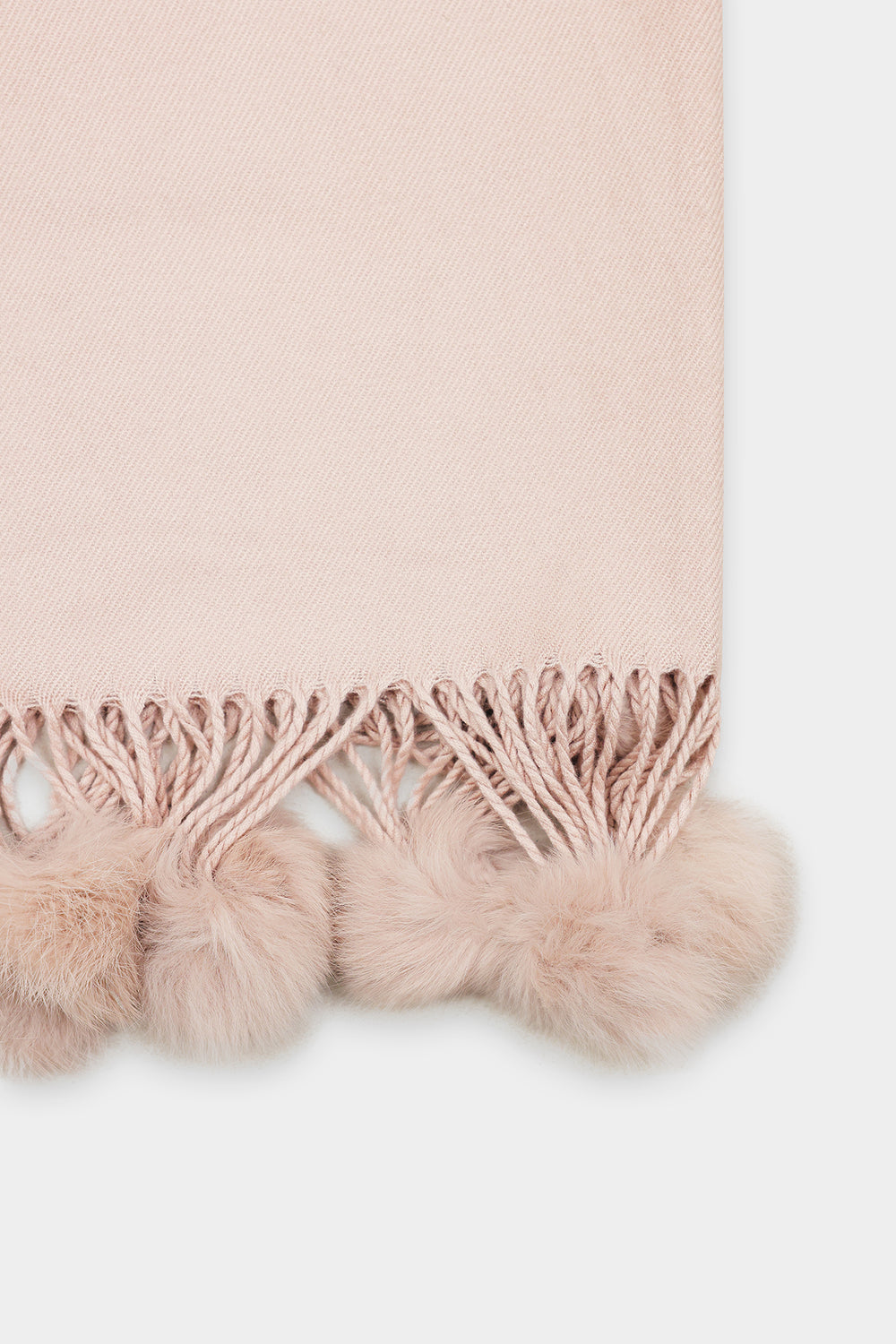 Add a touch of playful luxury to your winter look with this elegant scarf. This cozy shawl is crafted in a beautiful soft pink fabric. The simple, textural body drapes elegantly, while the ends are adorned with playful soft faux fur pompoms in a matching color. The unique finish adds a chic, whimsical detail to this essential cold-weather accessory.