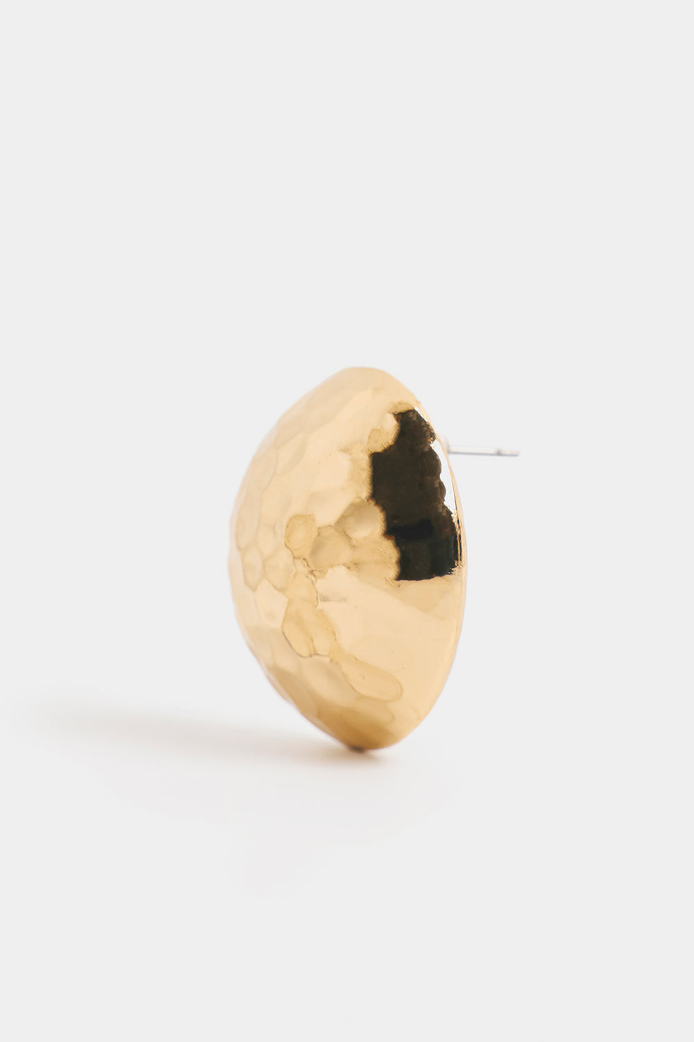 Bring a touch of modern luxury to your everyday look with these striking gold-toned stud earrings. The earrings feature a bold, slightly oversized dome shape with a unique, all-over hammered texture. This highly reflective finish beautifully catches the light, giving the illusion of movement and adding an artisanal, opulent feel to a classic shape. They are the perfect statement stud to wear for effortless, elevated style.